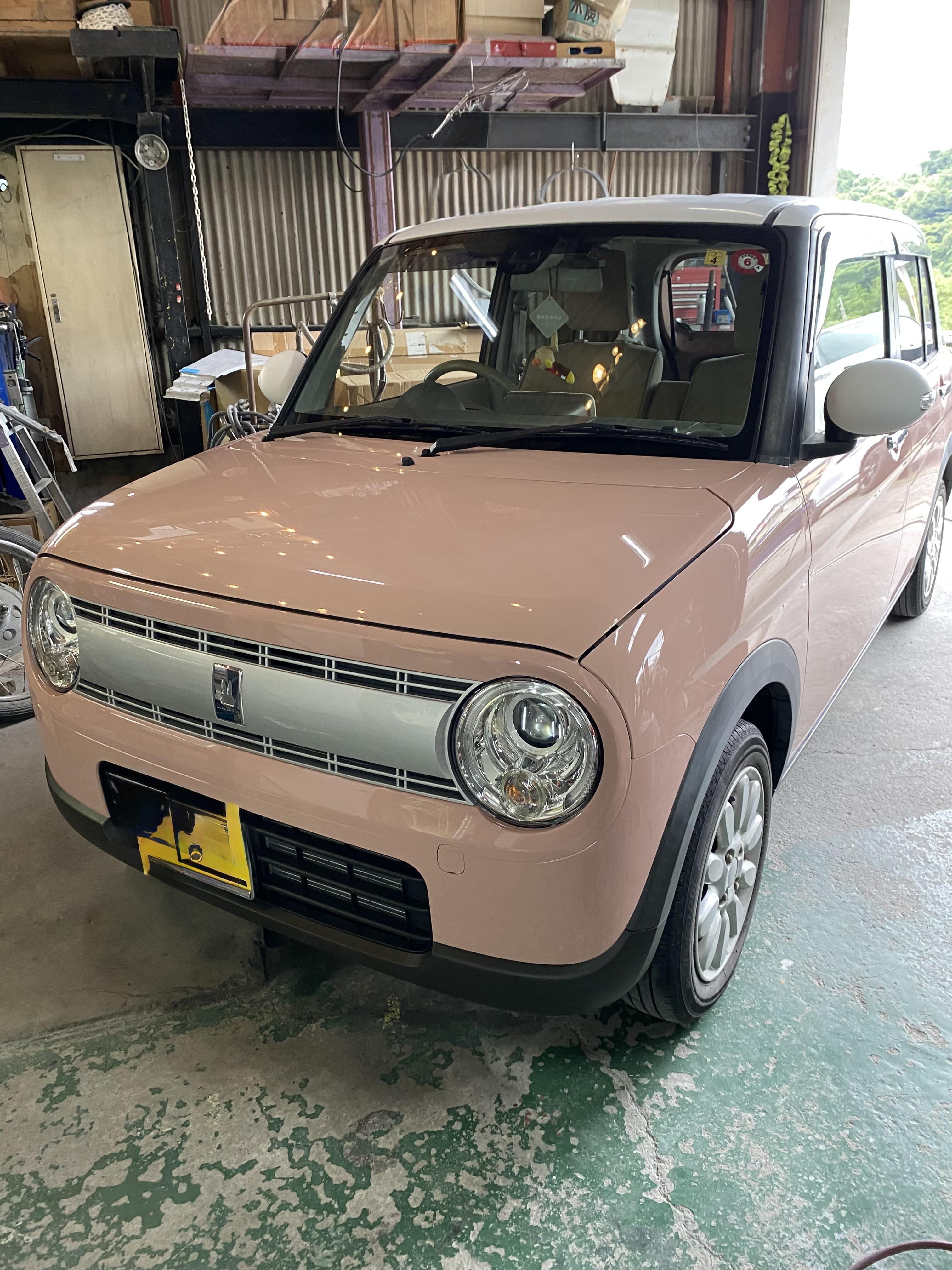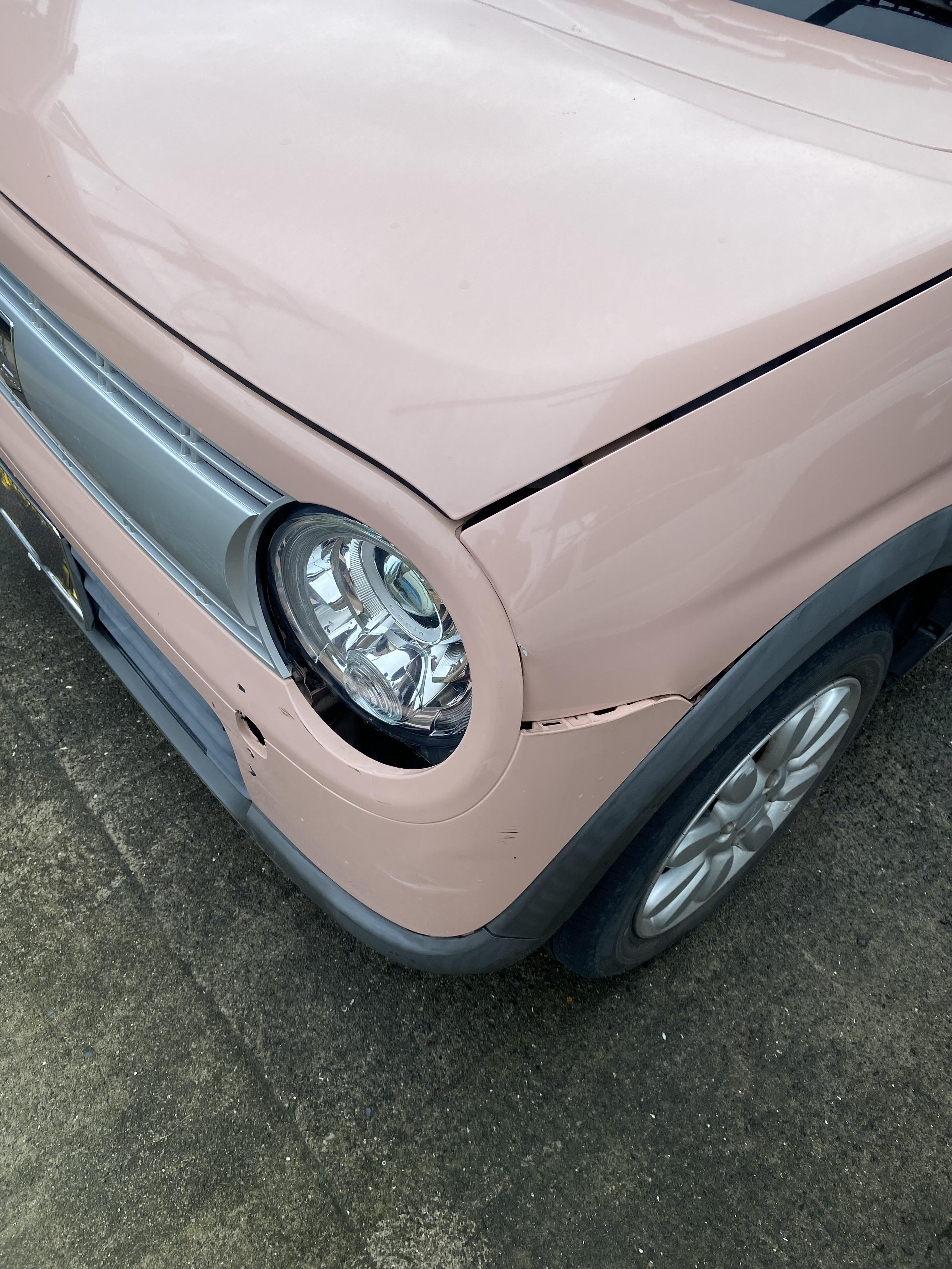 スズキ ラパン交通事故によりヘッドライト、バンパーが押され中に入ってしまっていました。車両保険にて対応させていただきました。ライト、バンパーは新品交換です。