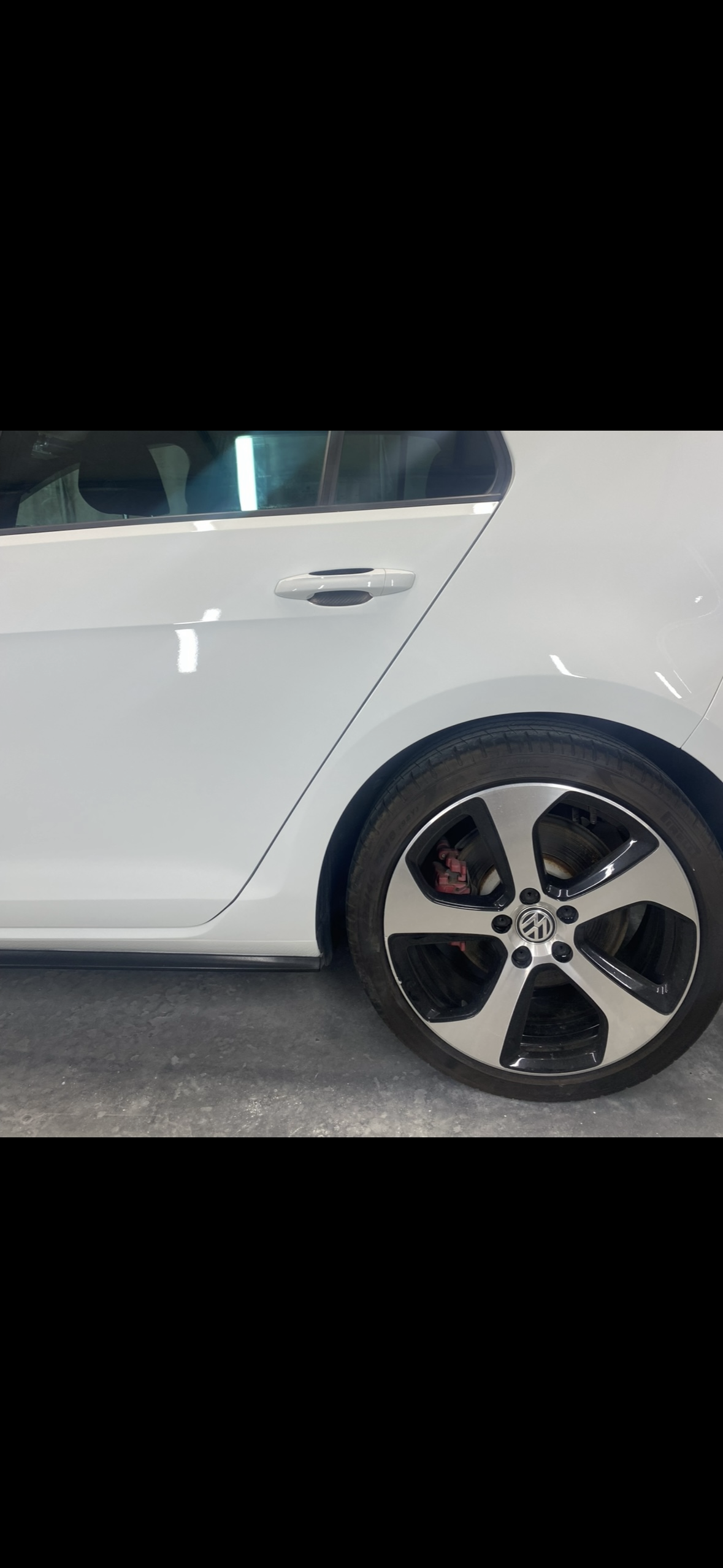 VW GOLF左の後ろにキズ、凹みがありました。左リアドア、クオーターパネルの鈑金です。鈑金塗装では特に多い巻き込みでの損傷です。