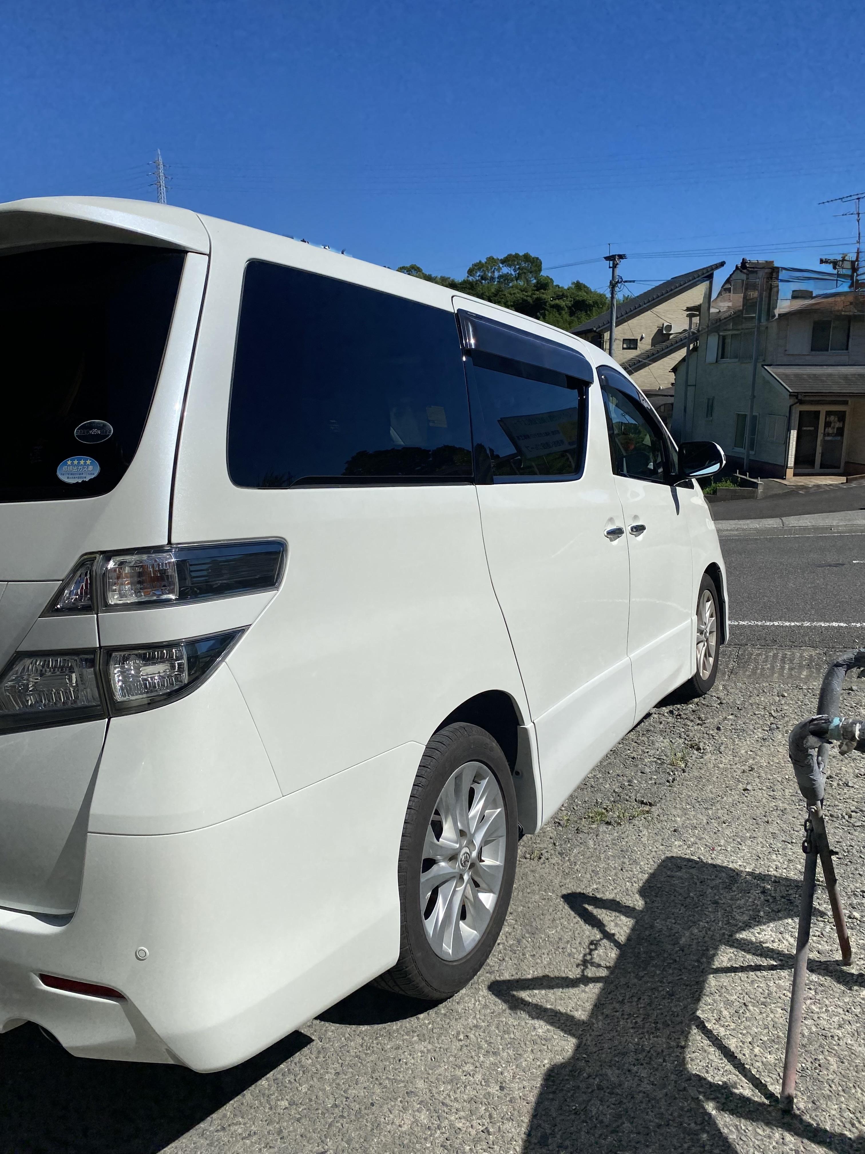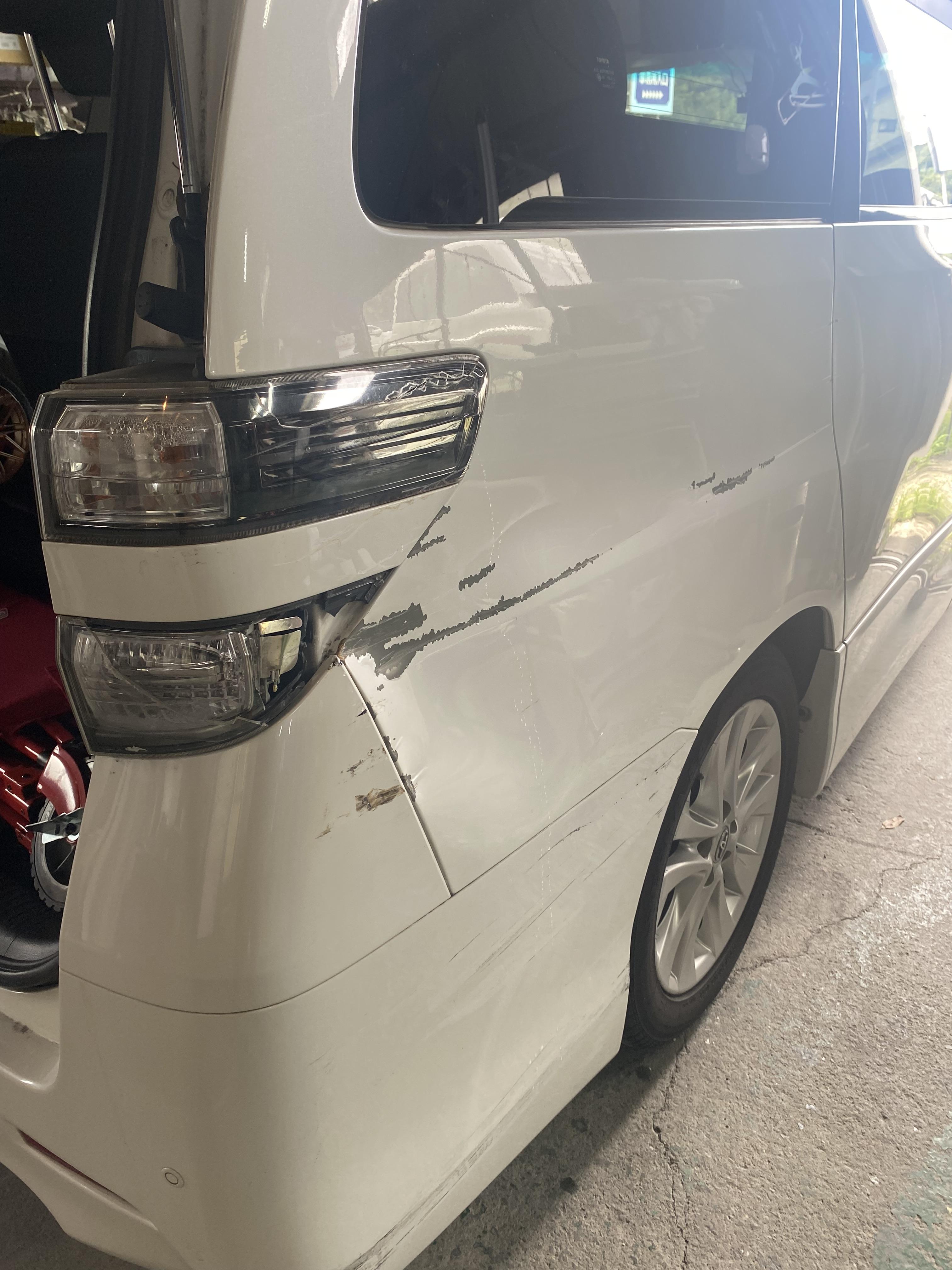 トヨタ ヴェルファイア 停車時に他車両の右折に巻き込まれ大きく凹んでいました。後ろの座席や内装を外し、裏から凹みを叩き出して鈑金で修正しました。